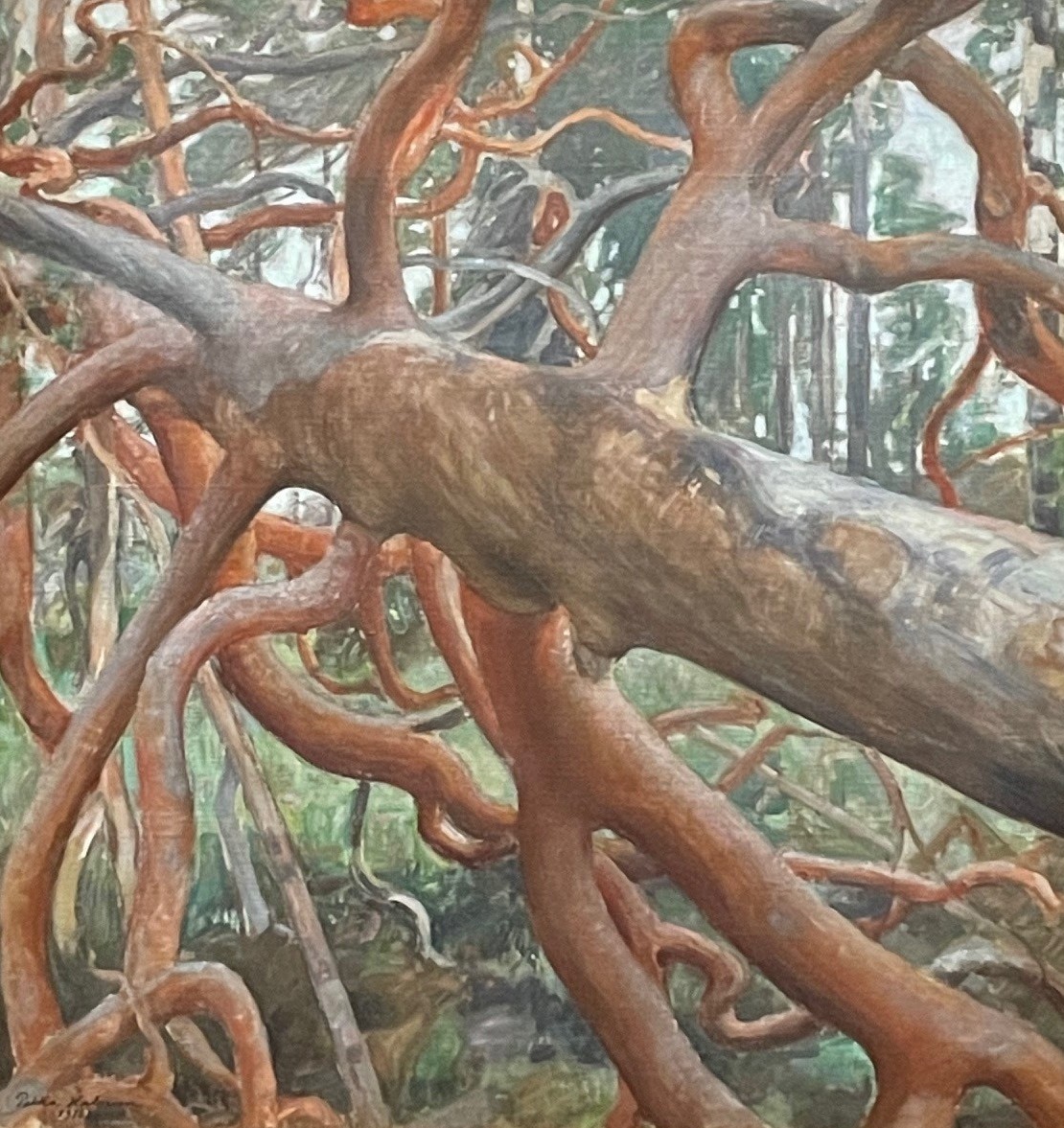 Une autre toile de Pekka Halonen m’a replongé dans une histoire récente, qui a fait l’objet du billet n°215 « Abattu, Sansal »… « Le Grand Pin de Kotavuori » peint en 1916 représente un arbre couché, prêt à être débité. La composition est puissante avec sa perspective en diagonale du tronc reposant sur ses branches affolées. C’est, en équivalant poétique, « La Mort du Loup » d’Alfred de Vigny. D’ailleurs sur le cartel placé à côté du tableau est écrit : « L’image de ce pin abattu aux branches entremêlées témoigne de l’empathie de l’artiste avec la nature. Conscient de l’exploitation des ressources naturelles pour l’industrie du bois en pleine expansion, le peintre alerte avec ce portrait d’arbre sur l’inévitable dégradation de cet environnement sauvage. » Après ce rapprochement avec ce pauvre marronnier à Argentine, on pourrait faire un autre rapprochement avec le dérèglement climatique et cette terrible tempête de 1999-2000 qui abattit tous les arbres sur son passage !